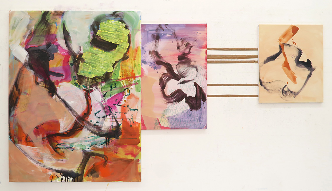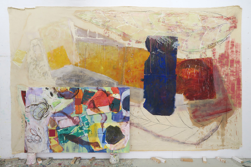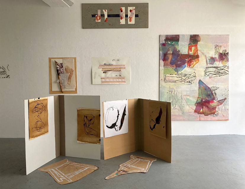 Martin Conrad "Schlaf über dem Tal" 2009/2024, Acryl, Öl, Leinwand auf Leinwand, Hartfaser, 182 x 90 cmMartin Conrad "Safrangelbes Jagdgewand mit rotem Saum 6" 2020, Acryl, Tusche auf Leinwand, Graphit auf Papier, 97 x 156 cm (3-teilig)Martin Conrad "Summe 1983-2021" "Nüsse Stehen-Liegen", 1983, Acryl, Kohle, Öl, Papier auf Baumwolltuch, 285 x 450 cm - davor: "Safrangelbes Jagdgewand mit rotem Saum 1", 2021, Acryl, Chinapapier, Tusche auf Leinwand, 125 x 200 cm Martin Conrad "Augenbänder und Echoraum 3" 2021, Acryl, Tusche, Leinwand auf Leinwand, Papier, 180 x 106 cm (3-teilig)Martin Conrad "Safrangelbes Jagdgewand mit rotem Saum 8" 2021, Acryl auf Leinwand, Papier auf Wand, 130 x 240 cm, (4-teilig)Martin Conrad "Augenbänder" 2020-21, Acryl, Tusche, Baumwolle, Chinapapier, Biber-Holz auf Papier, 80 x 60 x 5,5 cmMartin Conrad "Denkmodell für eine Form" Photo.Kunst.Raum. Hamburg, 2022Martin Conrad "Wie sie die offene Ebene 1" 2020-22, Acryl, Hartfaser, Tusche, Radierung auf Bütten, Chinapapier auf Leinwand, 180 x 120 cm Martin Conrad "Wie sie die offene Ebene/der schlafende Apoll" 2021-22, Acryl, Leinwand, Hartfaser, Keilrahmen, 112 x 155 cm, 160 x 160 cm (6-teilig)