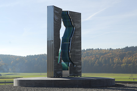 2007-2010, Aluminiumgusshaut, Acrylglas, Schwarzlicht, Höhe 550 cm, je Flügel 210 cm, Tiefe 60 cm. Standort: B31, Ausfahrt Stockach Ost, Blumhof