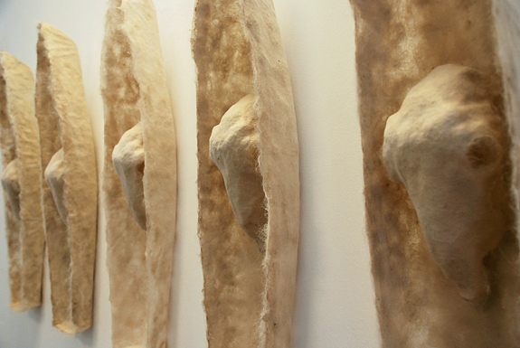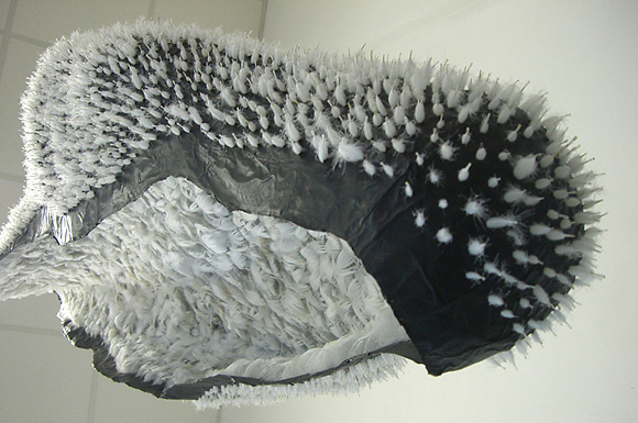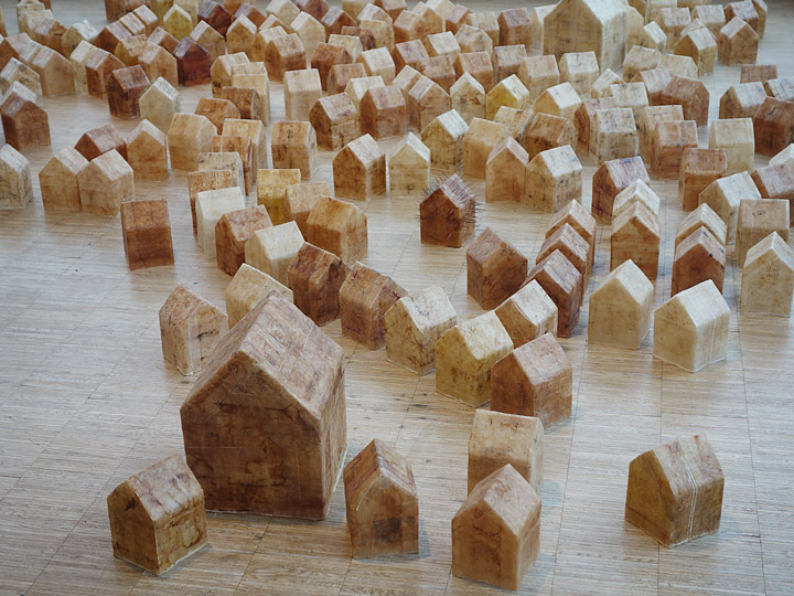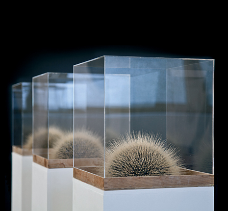 Petra Jung "stay at home" 2020-2022, Häuschen aus Teebeutelpapier, je 16 cm Höhe, großes Häuschen: 35 cm HöhePetra Jung "das halbe Leben" 2019, Teebeutelpapier, Silikon, Stacheln, je ca. 7 x 14 x 14 cm auf drei Sockeln (je 100 x 30 x 30 cm) mit Spiegeln und Acrylglashaube (30 x 30 x 30 cm)Petra Jung "o. T." 2015, Teebeutel, Silikon, Folie, 12 x 24 x 16 cmPetra Jung "o. T." 2014, Teebeutel, Silikon, Haare, 10 x 28 x 11 cm, Foto: Christoph M. FrischPetra Jung "vom Setzen der Saat" 2014, Grassamen, Wattestäbchen, Styropor, Holzkörper, 20 x 30 x 30 cm, Foto: Michael HoraczekPetra Jung "wohin mein Boot?" 2013, Haare, je 72 x 16 x 15 cmPetra Jung "Kokon" 2008-2012, Objekte aus Papier und Federn, zwischen 65 und 150 cm hoch