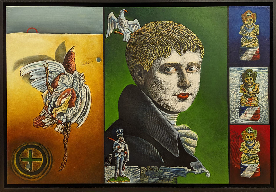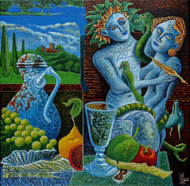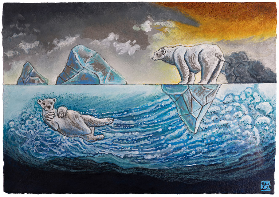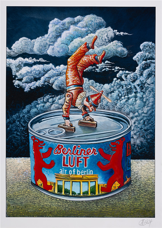Harald-Alexander Klimek MfA "Berliner Luft" 2024, Mischtechnik auf Büttenpapier, 42 x 29,7 cm. Foto: Marko Schnorr, Frankenthal (Pfalz)Harald-Alexander Klimek MfA "Astwerk einer alten Eiche" 2024, Bleistiftzeichnung, Aquarell Colorierung in Blaugrau auf Zeichenpapier in Weiß, 25 x 24 cm. Foto: Marko Schnorr, Frankenthal (Pfalz)Harald-Alexander Klimek MfA "Ursus maritimus" 2023, Mischtechnik auf handgeschöpftem, graufarbigem Bütten von Gangolf Ulbricht (Berlin), 29,5 x 41,5 cmHarald-Alexander Klimek MfA "Jupiters blaue Stunde" 2023, Öl auf Leinwand, 50 cm x 50 cm, Privatbesitz. Foto: Marco Schnorr, FrankenthalHarald-Alexander Klimek MfA "Aggregatzustände" 2022, Gouache auf Karton, 29,7 x 42 cmHarald-Alexander Klimek MfA "Zwei Systempraktikanten" 2022, Öl auf Leinwand, 85 x 65 cm. Foto: Mario Geldon, LambsheimHarald-Alexander Klimek MfA "Dein Ritter Hultenreich" 2022, Grafik HUL + HAKHarald-Alexander Klimek MfA "Das Universum der Fischköche im AquaLand" 2021, Öl auf Leinwand, 80 x 60 cm. Archiv Galerie Anke Zeisler, Berlin. Foto: Mario Geldon, LambsheimHarald-Alexander Klimek MfA "Vor oder hinter der Mauer stehend ist der Himmel darüber immer gleich blau" 2019, Öl auf Leinwand, 40 x 40 cm. Archiv: Galerie Anke Zeisler, Berlin. Foto: Mario Geldon, LambsheimHarald-Alexander Klimek MfA "Drei auf einen Streich" 2011/2023, Print, Mischtechnik in Öl auf Leinwand, 61,2 x 90 cm. Lhg. von Ingenieurbüro Frank Thurecht, Schriesheim. Foto: Horst Kirsch, Frankenthal (Pfalz)Harald-Alexander Klimek MfA "Henriette mein Käferchen" 2011, Mischtechnik und Computercollage auf Karton, 42 x 29,7 cm. Smlg. Kleist Museum Frankfurt/Oder. Litho: CPS Udo Weber und HAK, Frankenthal (Pfalz)