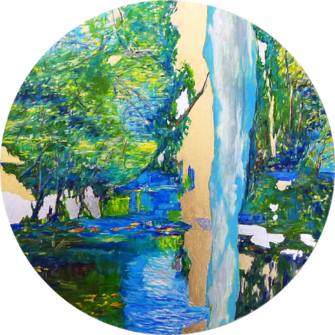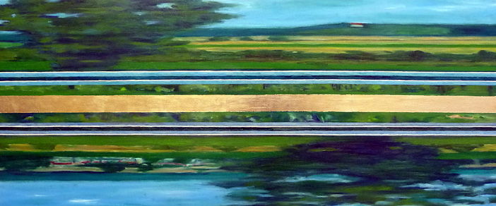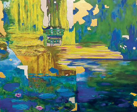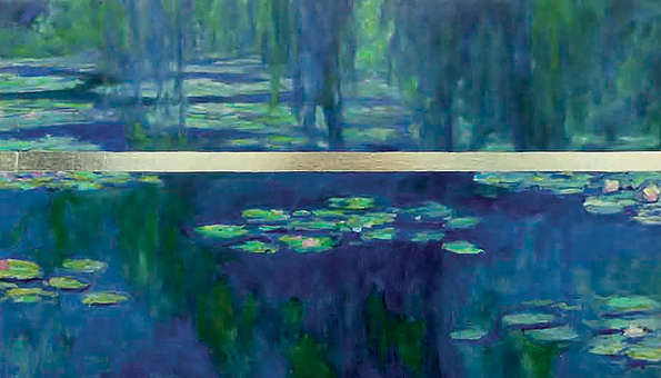 2017, (Variation zu C. Monet, Seerosen, 1914/17, Neue Pinakothek München), Holz, Öl, Silberalu, 40 x 70 cm