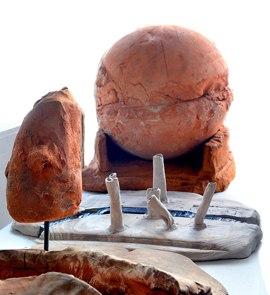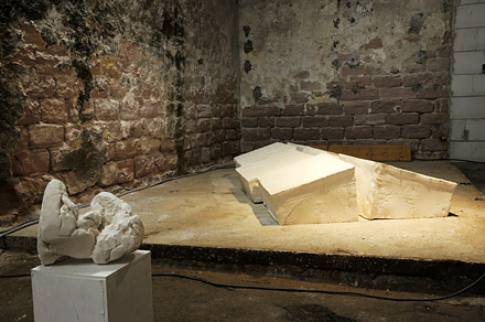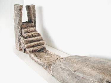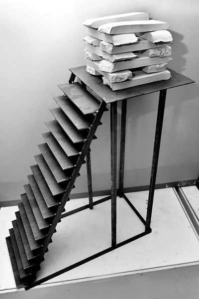 2012, Ton/Stahl, 53 x 67 x 31 cm. Aus einem soliden Fundament ragen vier Stahlrohre und stützen das marode Gebäude.