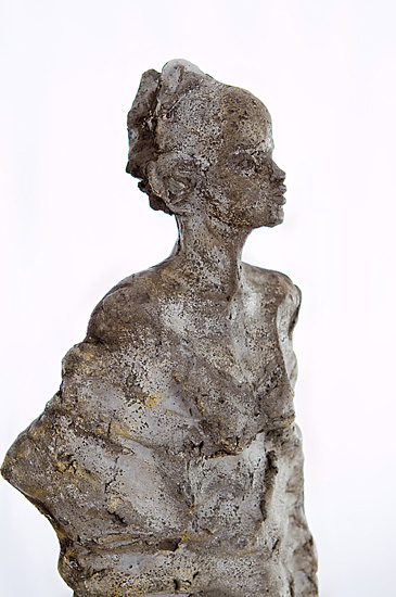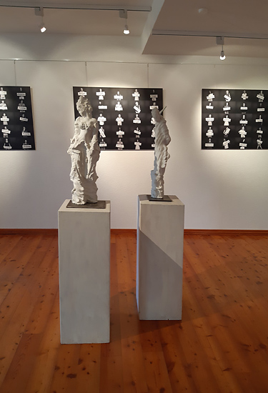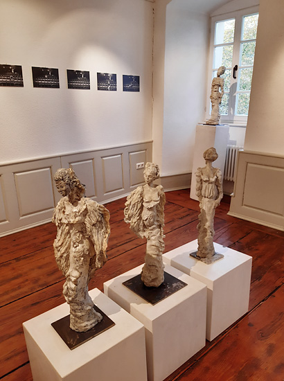 Petra Weiner-Jansen "Ausstellungsansicht (mit Martin Loos, Fotografie)" Sockel vorne: "Flügelträger I - gezeichnet", 2017 -"Flügelträger II - kennt sein Ziel", 2017 - "Mensch -wo bin ich, wann?", 2019. Sockel hinten: "Mensch - trägt schwer", 2013. Beton, gewachst, lasiert, ca. 70 bis 75 cm. Technik: verlorene Form. Foto: Petra Weiner-Jansen Petra Weiner-Jansen "Impuls Wolfgang Rihm I und II - vom Leben zum Tot" Beton aus Marmormehl, Zement, Glas ca. 75 cm hoch, Hintergrund Fotostrecke von Martin LoosPetra Weiner-Jansen "Mensch - Würde-voll" 2014, Beton, gewachst, lasiert, ca. 70 bis 75 cm. Technik: verlorene Form. Foto: Petra Weiner-Jansen