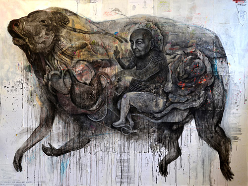 Im Rahmen unserer Reihe "Junge Künstlerinnen und Künstler" präsentieren wir den Künstler Dominik Schmitt, Jahrgang 1983. Dominik Schmitt lebt und arbeitet aktuell in Landau in der Pfalz. Sein Werk umfasst vor allem Malerei und Zeichnung, aber auch Film, Videokunst, Plastik, Installation, Musik und Lyrik. Thematisch beschäftigt er sich dabei mit Subjektivität und Fragen nach der Kunst und deren Begrifflichkeit. Stilistisch ordnet man ihn mittlerweile dem fantastischen Realismus zu. Gegenstand seiner Arbeit ist also die Realität, welche er fantastisch mit vielen Elementen verschiedener Kunststile umsetzt. So orientiert er sich kompositorisch an bühnenhaften Anordnungen der Gotik, verwendet Figuren, die man dem Surrealismus oder der Mythologie zuordnen würde und kombiniert seine Sujets mit dadaistischen bis provokanten Schrift-Elementen, welche den Inhalt und die Aussagekraft der Bilder beeinflussen und lenken.