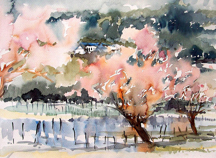Monika Cirica-Schneider: "Mandelblüte Villa Ludwigshöhe", Aquarell