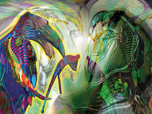 Aufgrund seiner jahrzehntelangen Erfahrung im Umgang mit Bildbearbeitungsprogrammen im Bereich des Designs ist der Künstler in der Lage kreativ aus dem Vollen zu schöpfen und verschiedenartige Bildbereiche für sich zu entwickeln. Gleich zwei solcher unterschiedlichen Bereiche werden in der Ausstellung gezeigt: Zum einen sind dies seine surrealen Bilder. Hier ersetzt der Künstler die typischen Techniken dieses Genres wie Frottage, Grattage und Écriture automatique gekonnt durch digitale Werkzeuge, um dann im zweiten Schritt des künstlerischen Prozesses die zunächst zufälligen Ergebnisse durch bewusste Ausarbeitung in neue fantastische Welten und Wesen zu verwandeln. Zum anderen werden Werke aus seiner Blister-Serie gezeigt. Hierbei handelt es sich um ungegenständliche digitale Malerei, die mit Linie, Fläche, Raum und Farbe spielt. Die durch ein Konzept vorgegebenen, starren geometrische Grundelemente werden dabei durch farbenprächtige Dynamik in Bewegung gebracht. So entsteht ein sehr reizvolles Spiel zwischen geometrischen und freien Formen.