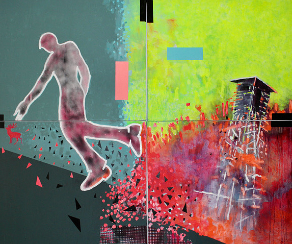 Motive wie der Hochsitz (Wachtturm) spielen als Metapher für Machtverhältnisse (Macht versus Ohnmacht) eine zentrale Rolle. Die Bildinstallation - IMAGINE - zeigt doch inmitten der Schrecklichkeiten der kriegerischen Auseinandersetzung in der Welt, ein Zeichen von Hoffnung und Zuversicht.