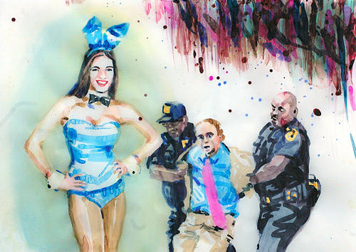 Cony Theis (geb. 1958), die erste der vier Stipendiaten. Sie hat sich in Edenkoben auf die Landschaft, vor allem aber auf deren Menschen eingelassen. Im Laufe der Monate entstand eine mit Aquarellen gefüllte Wand, die teils einzeln, teils mit einander vernetzt eine Geschichte des Ortes erzählt. Dabei spielen die Wälder und das Jagen eine große Rolle, Der Jagende und die Gejagten, die Lust am Abenteuer und der Freiheit, aber auch um düstere Geschehnisse, die in der Vergangenheit begraben liegen.