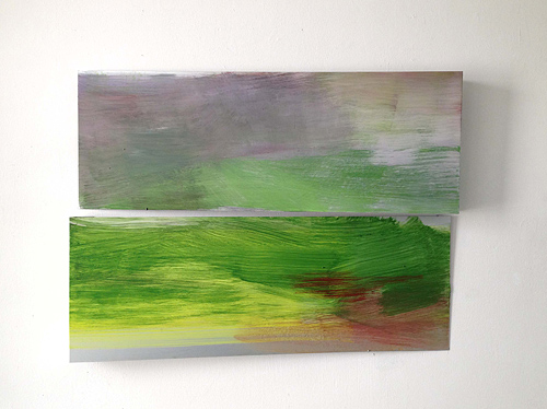Julia Lohmann (geb. 1954) arbeitet grundsätzlich abstrakt, zugleich aber wird ihre Malerei dreidimensional, indem sie Kuben oder wie in Faltungen angelegte Aluminiumplatten konzipiert. Sie begreift Malerei immer in ihrem raumbezogenen Kontext. Dazu nutzt sie als Trägermaterial Aluminiumplatten, die sich wie skulpturale Gebilde formt, teils mit Faltungen und Knicken, so dass Kontinuität und Diskontinuität in der horizontal gestreckten Fläche bereits angelegt sind. Durch wenige Farben, suggeriert sie Landschaftliches und zugleich einen Bewegungsfluss, der an filmische Sequenzen erinnert. Licht und Schatten und das Reagieren der Farben darauf steigern dieses "filmische" Wahrnehmen ihrer Werke. In Edenkoben hat sie nicht nur einen eigenen Landschaftsfries entwickelt, sondern auch ein Video entstehen lassen, das seinerseits den Ort unterschiedlich perspektivisch beleuchtet.