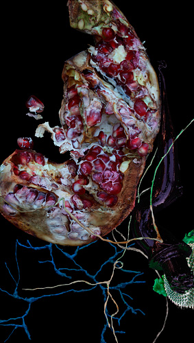 Die großformatigen Fotografien von Dagmar Hugk zitieren barocke Blumen-und Früchte-Stillleben, sie feiern die Schönheit der Formen der Natur im Wissen um Verfall und Tod.