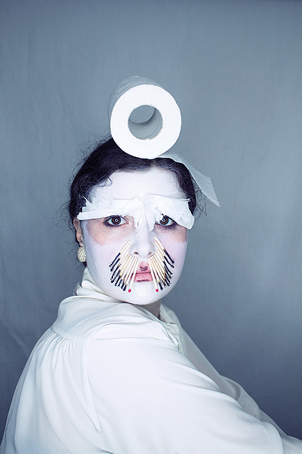 Glambage [glamour + garbage] - Die Glambage-Masken entstehen durch das Zusammenspiel von konventionellen Gebrauchsgegenständen, ihrer Funktion und Nutzung. Die Masken erinnern sowohl an gewöhnliche als auch an spezielle Ereignisse, Situationen, Gemütszustände oder Tätigkeiten. Durch die Inszenierung auf dem Gesicht der Künstlerin entstehen Charaktere, die das Bekannte in ein neues Licht setzen und verblüffende Wirkungen erzielen.