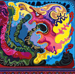 Die Malerei von Peter Zimmermann, z.B. sein Bild "off", ist dafür ein markantes Beispiel. Seine im Computer erzeugten fließenden Formen werden auf Folie gedruckt, auf die Leinwand projiziert und dort, nach Abzeichnung der Umrisse, schrittweise mit Epoxidharz gegossen.