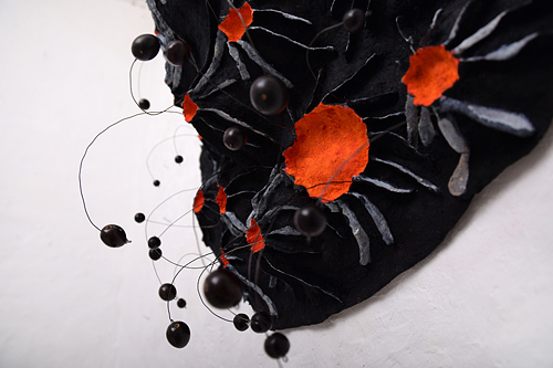 Etwas Ungewöhnliches scheint aus der Wand gewachsen zu sein. Anderes erstreckt sich mit seinen langen Tentakeln von der Decke zum Boden. Die farbigen Objekte aus Stoff und geschöpftem Papier schweben im Raum, liegen auf dem Boden oder bewegen sich über die Wände und bilden einen eigenen Kosmos. Sinnlich leuchtende Farbigkeit verführt im Wechsel zu spröder Schwärze. Öffnungen lassen ein geheimnisvolles Inneres erahnen. Die Oberflächen der plastischen Formen sind mit Lamellen oder Netzstrukturen überzogen, die sich mitunter in rhythmischen Linien weiter in den Raum erstrecken. Die Werke spiegeln eine ästhetische Suche nach Schönheit, die auch Brüche integriert.