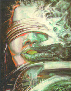 Die "Zahnbilder" folgen als nächste Serie, die bis Anfang der 1990er entstand. Ursprung dieser Reihe war ein Bildband über Zahnauswucherungen, die Andreas bei einem befreundeten Zahnarzt sah. Fantastische Formen und Farben taten sich da für das Künstlerauge auf, sie blieben hängen, mussten gemalt werden. Das zweite Thema der Reihe ist "Leben rückwärts" - Leben, das nach Genmanipulation ein abseitiges Eigenleben entwickelt. Also haben wir es hier mit den möglichen Schäden von Genforschung auf die Umwelt zu tun. "Das heilige Gen" ist eine Arbeit, die auch das Ethos Familie und den Sinn der Fortpflanzung ironisiert.