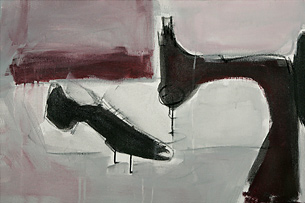Ihre gemalten Schuhe, die auf flächigem Untergrund zu schweben scheinen, oder begleitet sind von Maschinenteilen, gehören nicht zu einer bestimmten Trägerin oder einem Träger. Es liegt im Auge des Betrachters sich den/die jeweiligen Träger vorzustellen. Die Bilder und Objekte geben Raum für freie Assoziationen.