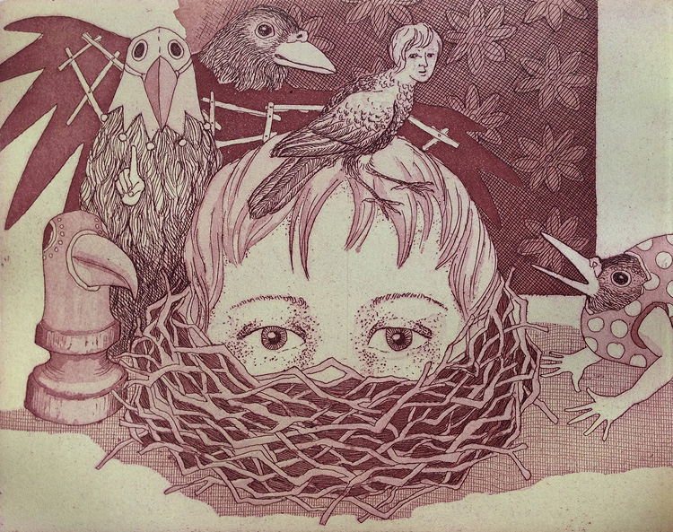 Annet Kuska: "Carnival of Birds #4", Farbradierung, Aquatinta, 20 x 24 cm