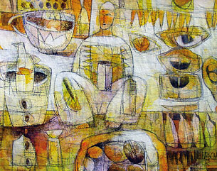 Das klang bis jetzt vielleicht ein wenig ernsthaft - mit Bloch und gar noch Nietzsche als Zeugen. Hier fehlt aber noch eine ganz wesentliche, schillernde Facette, ohne die bei Armin Liebscher auch nichts geht: Der Abstand im Augenzwinkern, die Brechung durch Humor. Der ihn zwingt, die Exotik, das Kulthafte, die "Verklärung auf Seiten des Reisenden" ebenso wie auf Seiten der dort Lebenden - den Kitsch gar - zu integrieren! Ein Spiel auch! Lust eben auch - an dem, was man macht! Lust am Vexierspiel, am Surrealen. So taucht mitten im Gewühle eines Basartisches vielleicht eine Palme auf. "Ich liebe Palmen" sagt er ganz einfach. Oder ein Musiktitel fällt ihm während des Tun's ein.