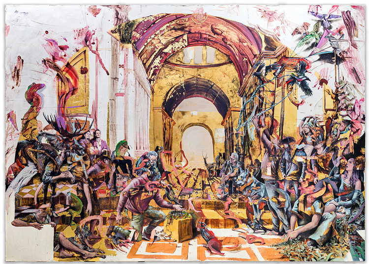 Benjamin Burkard zeigt in seiner farbgewaltigen Malerei Versatzstücke aus vergangenen Zeiten, die er in einen gegenwärtigen Kontext setzt. Gleichzeitig wird die Motivik aufs Neue verhandelt und gedeutet. Vermeintlich Historisches erhält ein modernes Gewand, Werte und Normen werden hinterfragt und neu erzählt. Menschen, Tiere und Pflanzen gehen ineinander auf, Maschinen verwachsen, Gesichter bleiben blind. Die Bilderwelt ist kryptisch und gleichzeitig narrativ, vieles vermeintlich nicht zu Vereinbarende verschmilzt und erschafft neue verblüffende Inhalte. Dabei greifen Abstraktion und Gegenständlichkeit ineinander über, so stehen konkrete Pixelelemente neben altmeisterlicher Malerei. Neonfarben leuchten neben Blattgold und metallischen Folien. Die behandelten Sujets sind komplex und ironisch, es fehlt aber auch nicht an Tiefsinnigkeit.