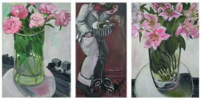 Bettina Kresslein: "Pfingstrosen | Mann im Bistro | Pfingstrosen und Lilien", Acryl auf Leinwand