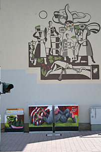 Einer der exponiertesten Plätze dieses Projektes, das mittlerweile in ganz Deutschland Nachahmer gefunden hat, die große Kreuzung von Rheinstraße, Moltkestraße und Ostring, gegenüber dem Haupteingang des Justizpalastes, glänzt wieder mit einem neuen farbenprächtigen Großgemälde der Jockgrimer Künstlerin Bettina Kresslein.