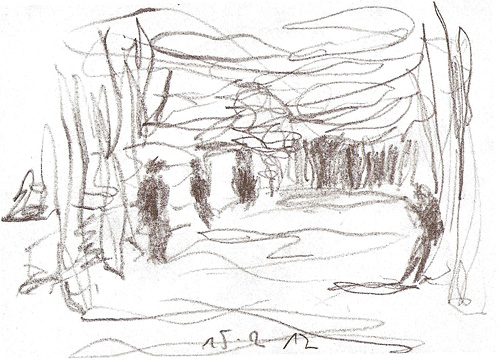 Michael Heinlein: "Rheinallee", Januar/Februar 2012, Bleistift auf Papier. Minutenzeichnung nach der Ölskizze von Hans Purrmann, entstanden im Purmannhaus.