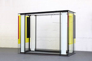 Eine Reihe großformatiger Plastiken sind erstmals in einer Museumspräsentation zu sehen. Sie sind aus Eisengerüsten gebaut und mit einem Dach oder transparenten Glaswänden versehen, die teilweise farbig bemalt sind. Camill Leberer geht es hier um einen abstrakten Raum, nicht um eine konkrete Raumerfahrung. In seinen installativen Plastiken, die sich unabhängig von Zeitphänomenen behaupten, ist eine umgrenzte Leere unmittelbar präsent. Sie schafft eine geheimnisvolle Distanz. Diese räumliche Leere wird scheinbar durch Farbe begrenzt. Tatsächlich aber öffnet die Farbe den Raum; ein Anliegen, das Leberer immer weiter verfolgt. Setzt er Schrift ein und nimmt Bezug auf bestimmte Inhalte, entstehen poetische Aufladungen, die werkkonstituierend wirken.