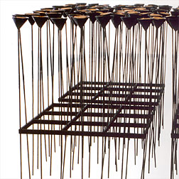 Aber der Flüchtigkeit und Vergänglichkeit des Blühens auf dem Wege zum Reifeprozess wird durch das Material Eisen Beständigkeit verliehen, wenn auch der Erdbezug dadurch verloren gegangen ist. Die Skulptur steht auf fragilen Stützen und ist keineswegs verwurzelt. Die in der Natur nicht vorhandene Verstrebung als technisches Element hat den Aufbau stabilisiert, nicht das "natürliche" tiefe Einsinken in die Erde. Eine Entwurzelung als Befindlichkeit wird auch der schwarze Granitfußboden des Kellers in der Städtischen Galerie verstärken.