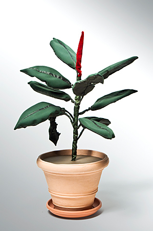 Auch eine Uniform kann das Äußere verändern, den Körper umschließen, vielleicht sogar zum identitätsstiftenden Merkmal werden. Der Berliner Künstler Peter Rösel stellt Pflanzenskulpturen aus Polizeiuniformen her und verweist damit ironisch auf das Phänomen eines Identitätswechsels. Sein "Ficus Elastica decora" aus dem Bestand des mpk gehört, wäre er kein Kunstobjekt, zu den sonst wenig Beachtung findenden Büropflanzen. Unprätentiös lässt er sich an wenig spektakulären Orten platzieren. Entdeckt man ihn auf einem Sockel in einem Ausstellungsraum zwischen Mittelpunkt des Betrachterinteresses. In welcher Hülle steckt welcher Inhalt? Ist die Hülle der Inhalt? Welche Wirkungen können Materialien oder Assoziation desselben hervorrufen? Solche und andere Fragen stellt auch Kitzingers Malerei.