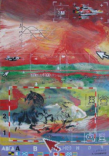 Ein Werk des französischen Künstlers, das auch die Einladung zur Vernissage ziert, stellt die Inszenierung einer mythischen Erzählung dar, die einen Darstellungsraum widerspiegelt, in dem man scheinbar Bekanntes unter verschiedenen Aspekten sehen kann. Die Darstellung der Geschwindigkeit über der gemalten Szenerie mit ihren Objekten zeigt in zeitgenössischem Stil ihre Dramatik.