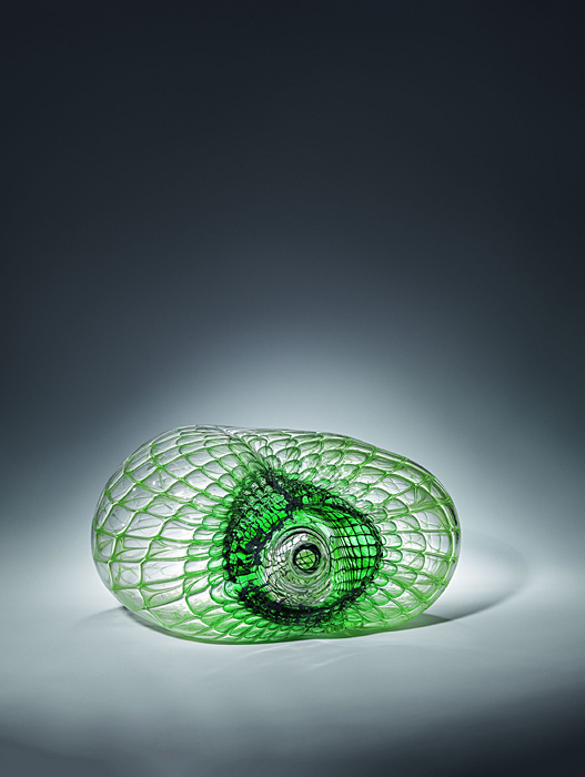 Glasobjekte von Jörg F. Zimmermann offenbaren einzigartige wabenförmige Räume, ermöglichen Ein- und Durchblicke in bizarre, fremde Welten. Die Verbindung von zart farbiger Lineatur und spannungsvoll gewölbtem Glas lässt Zerbrechlichkeit und Beständigkeit, Veränderung und Stillstand zusammenklingen.