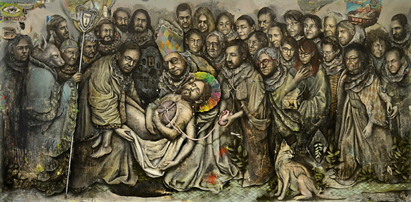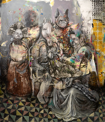 Dominik Schmitt ist nicht nur Maler und Zeichner, sondern schafft auch filmische Arbeiten, Plastiken, Installationen, Musik und Lyrik. Schmitts Bilder werden von einem dunklen, geradezu düster wirkenden Kolorit beherrscht. Seine irritierenden, melancholischen Bildwelten zeigen das Innere der Körper von Tieren, Menschen und geheimnisvollen Mischwesen. Zugleich gibt es in den Bildern unverkennbar auch eine ironisch-witzige, bewusst kindlich-naive Seite. Immer wieder hinterfragt er in seinen Arbeiten die Kunst an sich wie auch seine eigene Subjektivität. Seine großformatigen Arbeiten erstellt er in Mischtechnik, mit Papier und Tapetenkleister, Acrylfarbe und Wasser, Ölfarbe, Stiften und Kreiden oder auch Sprühschablonen.