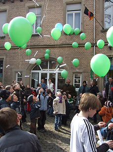 Am Sonntag war es endlich soweit: Auf Los öffneten rund 40 KUK-Kinder von innen das noch verhüllte Tor und strömten in den Hof, wo sie grüne Luftballons mit angehefteten Grüßen und Wünschen für die Zukunft in die Luft entließen - eine Aktion, die auch als Ballonflugwettbewerb konzipiert war.