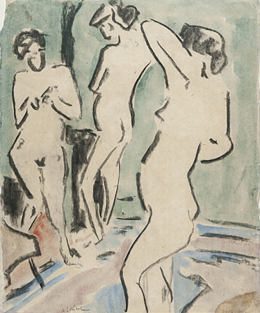 Ernst Ludwig Kirchner: "Drei nackte Mädchen im Raum", 1909, Aquarell und Kreide