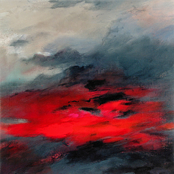 Entree - Raum VI "Die abgelaufene Zeit", Acryl auf Leinwand: Mit der Zeit und der Anzahl der menschlichen Fußspuren, wird die weiße Straßenmarkierung abgetragen, also der schwarze Asphalt der Straße freigelegt. Es entsteht ein "aperer" Zebrastreifen. Ein Maß der "Lebenszeit" Raum I und II 1. "Farbe der Zeit" - Ausgangspunkt ist das Abendrot. "Wahrnehmung der Zeit des Vergehens. Die verschiedenen Phasen des Farbwandels vom brennenden Rotorange bis zum tiefsten, lavaartigem Schwarz, dem Absterben, Entschwinden, Verlöschen des Lichts." (Dr. Hauser-Suida)