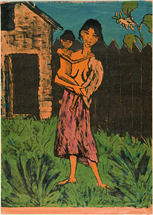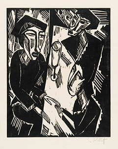 Karl Schmidt-Rottluff gilt als der kompromisslose Vollstrecker des expressionistischen Holzschnitts, seine Blätter bedeuten die Konsequenz des reinen Flächenstils. Die Strenge seines Clair-Obscur-Holzschnitts ist monumental, er verzichtet rückhaltlos auf jede malerische Wirkung.