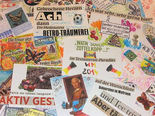 Kunterbunt und fantasievoll - von Besuchern gestaltete Postkarten im Aktionsbereich der Ausstellung "Arte Postale"