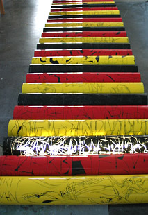 Jochen Frisch: "palimpseste der freiheit", Polyesterfolie, Lack, Neonleuchten, 400 x 100 x 15 cm