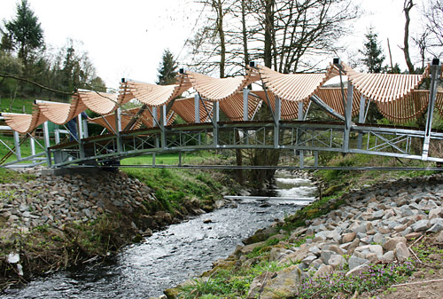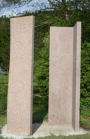 Die zweiteilige Skulptur "Le passage" - der Durchgang - ist wie eine offene Tür in der Landschaft. Sie lädt den Wanderern dazu ein, durch sie hindurch zu gehen. Bei der Gelegenheit stoßen sie auf ein kurzes Gedicht der Lyrikerin Felicitas Frischmuth (1930-2009), das Bertrand Ney dort links und rechts in ca. 2,2 m Höhe angebracht hat: "Wenn keiner drauf geht, verwächst der Weg. Wenn wir nicht gehen, verwächst der Weg."