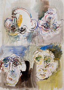 Da fallen einmal die "Köpfe" auf, die er aquarelliert hat. Für das Ausstellungsplakat und die Einladung zur heutigen Ausstellung wurde das Aquarell "Die Dichter" verwendet. Dann ziehen "Schriftsteller", ein mit Dispersionsfarbe und Bleistift gestaltetes Bild, "Der Heilige" mit Ölfarbe zu Papier gebracht und ein spitznasiger "Naturwissenschaftler" sowie ein "Bischof", durch einen nicht zu übersehenden Krummstab als solcher ausgewiesen, an unserem Blick vorbei. Jedes Bild für sich betrachtet, ruft spezifische Assoziationen hervor. Da ich selbst Naturwissenschaftler bin, habe ich den von Karbach erschaffenen Kollegen natürlich besonders intensiv, vielleicht auch ein wenig misstrauisch beäugt und - ja - irgendwie hat er schon etwas von einem fanatischen Wissenschaftler an sich, dieser spitznasige, in seine naturwissenschaftlichen Papiere vergrabene Forscher, der nichts anders als "Seins" gelten lässt.