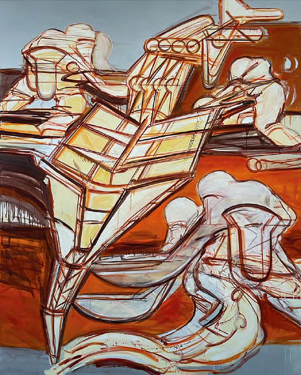Gerhard Fassel, Wiener Architekt, Maler und Bildhauer, setzt sich in seiner Arbeit mit Menschen auseinander, die mit Werkzeugen und Maschinen hantieren. Sandfarbene Maschinen mit rostfarbenen Konturen dominieren die Bilder.