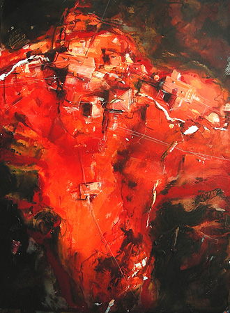 Bei "terra franconia" sind ganz einfach Bilder nach der Fantasie des Künstlers gemalt, alles entsteht im Kopf. Die Arbeiten sind aus dem Künstler herausgebrochen, oft in mühevollem Ringen mit Farben und Formen über Monate hinweg entstanden. In keiner Weise sind die Bilder, die den Flug eines Reihers über Urlandschaften suggerieren, gezwungen oder gekünstelt. Von den spannungsgeladenen Farb- und Formen-Feuerwerken geht eine eigentümliche Faszination aus. Wer sich auf die spannende Malerei von Gerhard Frank einlässt, durchläuft einen Crashkurs in Farbenlehre, begreift etwas von Leichtigkeit und Lastendem. Dabei ist die Landschaft nur Anlass für Form- und Farbkomposition, für das Spiel mit Kontrasten, Spannung, Strukturen und grafischen Elementen.