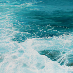 "Die Darstellung von Meer und Wellen, teilweise in fast fotorealistischer Technik gemalt, setze ich oft in Verbindung mit konkreten, nahezu monochromen, meist leuchtend blauen Farbflächen. Der lokale geografische Bezug wird dabei in eigenständige Bildzeichen übersetzt, die den Dialog mit Bildern der Kunstgeschichte bis hin zur Kunst der Gegenwart aufnehmen." (Hans-Georg Hofmann)