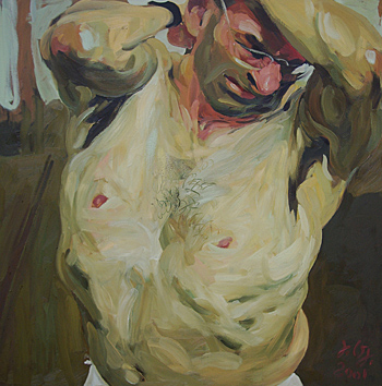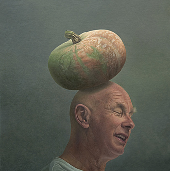 Johannes Grützke: "Selbst mit entblößtem Oberkörper", 2001, Öl auf Leinwand, 100 x 100 cm. Courtesy Galerie KK Klaus Kiefer, Essen