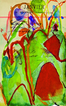 Als Bildträger seiner Aquarelle dienen Jahn Makulaturpapiere wie alte Kassenzettel oder Ausrisse aus benutzten Rechnungsbüchern. So bezieht er Aufdrucke und handschriftliche Relikte der Vorbesitzer in seine Bildregie mit ein: Die großen Buchstaben "T.S.F." zum Beispiel meinen "transmission sans fil", also die drahtlose Radio-Übertragung, sie standen auf dem Rechnungsblock eines Elektrogeschäfts. Oder der Quittungszettel eines sonntäglichen Januartags, "Janvier 31 Dimanche", offenbart die Speisenfolge eines Menüs, über der Jahn in leichten Farben gesättigt improvisiert. Und die Aufschrift "Vendu trois cochons" ist natürlich das Notat eines französischen Bauern über erfolgreiche Verkäufe auf einem ländlichen Markt. Zwischen den Spalten "DOIT" und "AVOIR" lebt Jahn sein künstlerisches Soll und Haben. Dabei geht es auch um Kommunikation, um Austausch mit dem jeweiligen anderen Lebensraum, um eine lyrische Vernetzung des Alltäglichen. Die kleinformatigen Aquarelle öffnen damit ein umfassendes Netz von Beziehungen, die sich entfalten und doch wieder zurückkehren und sich in einem Farbklang konzentrieren.