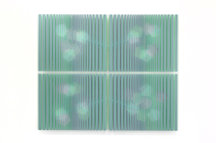 Westerfrölkes Werken gegenüber stehen die klaren, im komplexen Arbeitsprozess entstandenen, mehrschichtigen Glasmalereien der Düsseldorfer Künstlerin Gaby Terhuven. Ihre Wandinstallationen entstehen oft aus einer Vielzahl gleichartiger Module und stehen der sogenannten konkreten Kunst nahe. Durch ihre strenge Rhythmisierung und regelmäßige Muster vermitteln sie Ruhe und Ausgeglichenheit. Erst im Vorübergehen erfahren Besucher die gewollte Irritation - eine Bewegung, die im Auge des Betrachters entsteht und dabei über das Hier und Jetzt hinausweist.