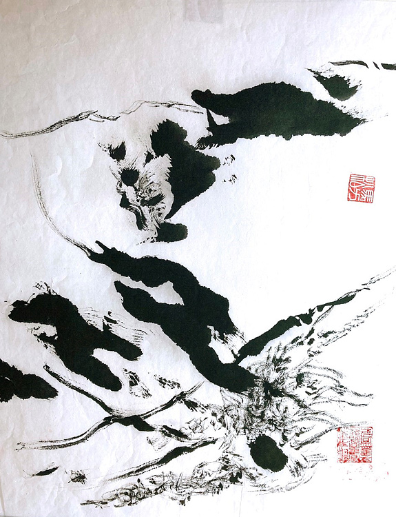 "Die Ästhetik der chinesischen Schrift verzaubert mich", erzählt Jean-Marie Péchenart, Leiter des Atelier des Art in Poissy. Schon in seiner Studienzeit näherte er sich dieser für ihn so faszinierenden Welt über Philosophie und Literatur. Doch erst vor 25 Jahren ließ er die Aquarellmalerei hinter sich, um sich den sogenannten drei Schätzen "Papier, Pinsel und Tusche" zu widmen. Der französische Künstler, der abwechselnd in Poissy bei Paris und Wien lebt, begann, mit einem Meister in Kalligraphie zu arbeiten, mit der in Wien lebenden Zaho Yusheng, Malerin der Pekinger Akademie. In Paris verfeinerte er seine Kunst mit Hilfe der Meister Wang Wa, Akedij und der Kalligraphin Fabienne Verdier. Schließlich konnte er auf einer Chinareise die erlernte Kunst hautnah kennenlernen, fühlen und spüren. Nicht nur alte Meister der Song und der Ming Dynastie wurden Referenzen für ihn, Quelle der Inspiration sind auch die abstrakten Malereien von den Meistern Zao Wouki, Lee Chun-Shan und der Ton Fa-Gruppe.