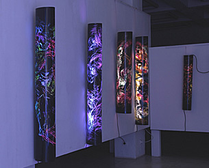 "Im Atelier steht eine ausrangierte Kleiderpuppe, die ich ab und zu umgestalte, indem ich sie drapiere oder zersäge und neu zusammensetze. Sie dient meinem Auge als Anregungs- und Anhaltspunkt. Ebenso verwende ich alte Anatomie-Lehrbücher, zum Beispiel das erste Anatomiebuch überhaupt, das der belgische Arzt und Anatom Andreas Vesalius im 17. Jahrhundert herausgegeben hat", erzählt der Künstler. Zu seinen Zeichnungen sind auch Lichtobjekte zu sehen, die er "Zeichenzylinder" nennt. Hier kratzt er die Zeichnung in transparente mit Lack beschichtete Polyesterfolie, die zu einem mit einer Lichtröhre versehenen Zylinder zusammen gefügt wird.