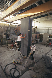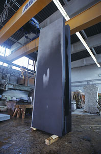 Während die Klangkünstler nun an ihrer Performance arbeiten, kümmert er sich um die Organisation des Transportes der über 4 Tonnen schweren Klangstele nach Landau und bereitet die Aufstellung des Werkes mit einem Spezialkran vor.