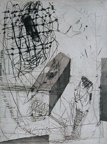 Die Realität hat ihn wieder mehr eingeholt – könnte man sagen. Aber es ist vielmehr so, dass seine künstlerische Vielfalt nebeneinander besteht. Mal malt er mehr – mal zeichnet er mehr. Gerade hat er eine Malpause eingelegt und sich mehr auf die Radierungen konzentriert. Spannend finde ich auch das Nebeneinander der unterschiedlichen Werke. Zusätzlich arbeitet Jürgen Braun noch parallel an mehreren Arbeiten und übermalt, zerstört und entwickelt neue Formen in unterschiedlichen Abstraktionsstufen.