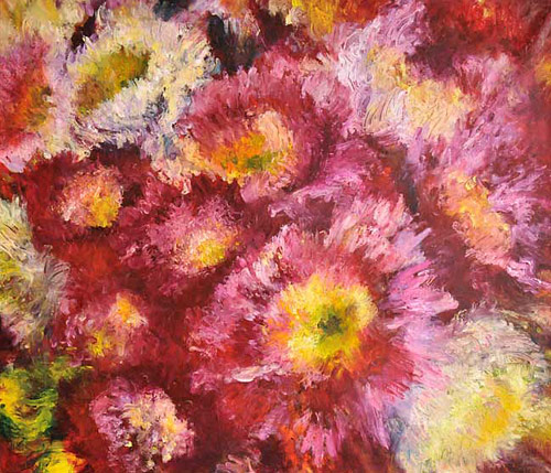 So spielt z.B. Pinsel als Arbeitsinstrument für Juliane Gottwald nur bei Grundierungen eine Rolle. Das eigentliche Bild entsteht, indem die Farbe mit Spachtel, Kelle oder Fingern aufgetragen wird. „Die Motive stammen alle aus der Region“, so Gottwald, seien es Astern, Zierkohl oder Tulpen. Und nicht zu vergessen der Kreppel in verschiedenen Variationen, ein seit Jahren wiederkehrendes Motiv.